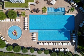 Собствен пясъчен плаж с малки камъчета и на платформа. 2 кея и бар, безплатни чадъри и шезлонги.