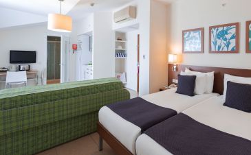Джуниър суит - 40 кв. м. заедно с балкона. Спалня (двойно легло и диван) с кухненски бокс (микровълнова фурна, хладилник, тостер). Максимално настаняване е 3 човека.
