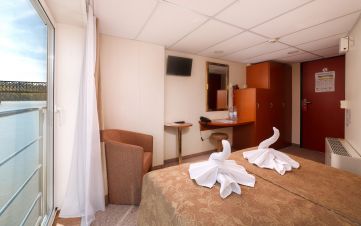 . Каютите са разположени на 3 палуби, като на основна палуба разполагат с илюминатори, които не се отварят, на средна с прозорци и на горна с големи френски прозорци, които се отварят. Всички каюти имат индивидуален климатик, сателитна ТВ, сешоар, баня и тоалетна.