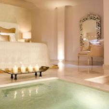 Климатик, телевизор, телефон, сейф в стаята, сешоар, халати и чехли, тоалетни принадлежности Apivita (гръцка натурална козметика), Мини бар Nespresso безплатно кафе, Безплатен WI-Fi 2, собствена веранда с гледка към калдерата и външен отопляем басейн, хамам, рум сервиз. Размер 80 кв. м.