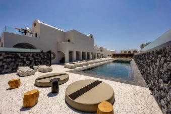 Хотелът се намира на 300 метра от плажа, в известния курорт Периса, на 12 километра от столицата на острова Фира. Летището на Санторини се намира на 10 км. Хотелът отваря врати през 2023 след пълна реконструкция.