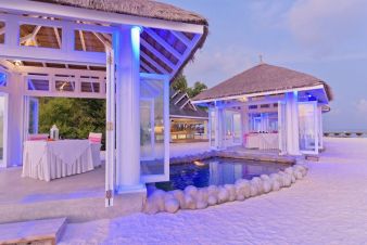 На разположние на гостите е "Sunset Restaurant" - основният ресторант на хотела, разположен над водата: закуска: 07:30-10:00 ч., обяд: 12:30-14:30 ч., вечеря: 19:00-21:30 ч. Шведска маса. Фюжън кухня. Организират се тематични вечери. А`ла карт ресторантите: Ресторант „Lagoon“ се намира до плажа с изглед към лагуната, отворен за обяд и вечеря от 12:00 до 22:30 часа. Средиземноморска кухня. „The Four Spices“ е азиатски ресторант, разположен над водата. Отворен за вечери по меню от 19:00 до 21:00 часа. За гостите, отседнали във вила с джакузи във Jacuzzi Water Villa, Prestige Jacuzzi Water Villa, Sunset Jacuzzi Water Villa и Presidential Suite, както и за гостите с план за хранене Premium All Inclusive, тук се сервира закуска на шведска маса от 7:30 до 10:00 часа. „The Plankton Grill“ е плажен ресторант с отворена кухня, който предлага морски дарове. Отворен е само за вечери от 19:00 до 22:00 часа. Необходима е резервация. „Island Pizza“ е пицария, разположена до басейна. Отворена е от 11:30 до 18:00 часа. Баровете: „Dhoni Bar“ - бар до басейна Infinity, сервира напитки и закуски. Западна и източна кухня. Работно време от 12:00-22:30 часа. „Sunrise Bar“ - бар до главния басейн Sunrise, сервира напитки. „Lagoon Bar“ се намира над водата и сервира напитки и закуски. Западна и източна кухня. Работно време от 12:00-22:30 часа.