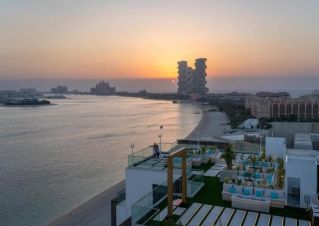 Хотел и курорт на брега на морето с изглед към Арабско море, с луксозни стаи и апартаменти, които се отличават със съвременен декор, драматично стенно изкуство, плоски екрани и стъклени балкони с гледка към океана и Палм Джумейра.