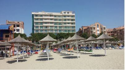 Собствен пясъчен плаж, на 50 м от хотела. Чадъри и шезлонги - безплатно.