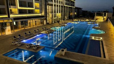 - Основен басейн, отопляем басейн, детски басейн, 2 водни пързалки за възрастни, 2 водни пързалки за деца