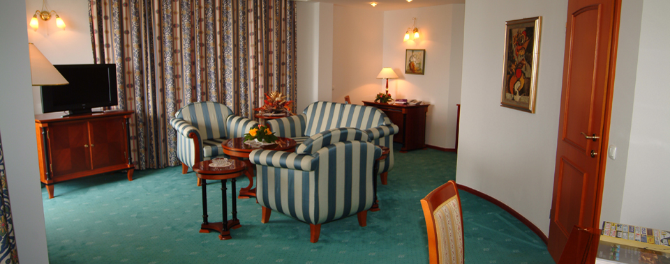 The accommodation part consists of five floors with the following content: 110 double rooms with the option of putting the third additional bed, 4 Standard suites (bedroom and living room), 1 Resident suite (2 bedrooms and living room), 1 Deluxe suite (bedroom and living room). All suites are air-conditioned and are luxury equipped, as other rooms in the hotel. There is separate room for room service on every floor. In all close areas in the building there is an excellent fire protection; fire detection system was installed, as well as, hydrant system, and fire prevention equipment.