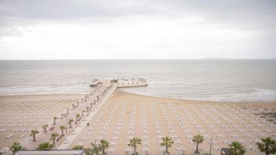 - Частен пясъчен плаж с шезлонги и чадъри