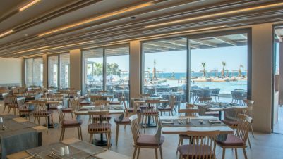 На територията на хотела: Хотелът разполага с два ресторанта (основен ресторант (сервира се на шведска маса) и гръцки ресторант а-ла-карт) и два бара, плувен басейн и басейни тип лагуна, воден парк с кът за отдих и уелнес център с успокояващ спа център и напълно оборудвана фитнес зала гарантират почивка. Разполага и с 24-часово обслужване на рецепция, паркинг.