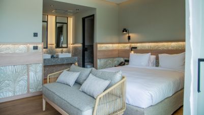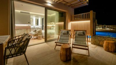 В стаите: Стаите са оборудвани с всички удобства. Предлагайки стаи с изглед към морето и частен басейн, луксозни апартаменти с частни външни джакузита, както и просторни стаи и апартаменти за семейства. Стаите са оборудвани с телевизор с плосък екран със сателитни канали, хладилник, сешоар и тоалетни принадлежности, както и с високоскоростен Wi-Fi интернет. Гостите могат да направят своя избор от стаи с изглед към градината или морето, частен басейн или външно джакузи и да се насладят на престой в Крит.