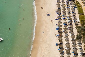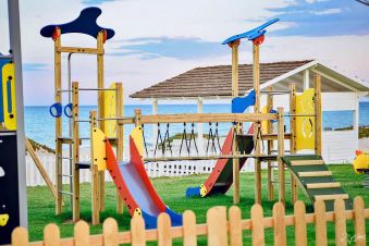Собствен, широк, пясъчен и леко наклонен плаж, първа брегова линия. Чадъри, шезлонги, матраци и плажни кърпи на плажа и при басейна - безплатно.