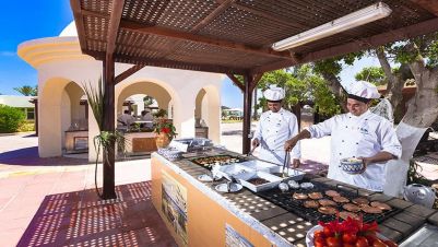 Изхранването е закуска, обяд и вечеря на блок маса с местна и интернационална кухня. Има възможност и за късна континентална закуска на плажа от 10.00 ч. Следобедна закуска се сервира от 15.00 ч. до 17.00 ч. Алкохолни и безалкохолни напитки се сервират от 10.00 ч до 0.00 ч.