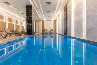 Собствен пясъчно-чакълест плаж с кей на 50 м от хотела. На разположение на гостите има и 2 открити басейна (единият отопляем), 1 вътрешен басейн (отопляем), 3 водни пързалки (без отопление).