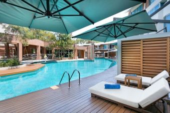 Апартаментите, разположени на първия етаж, имат директен достъп до басейна от терасата. Апартаментите, разположени на втория етаж, имат достъп до басейна по стълби.
