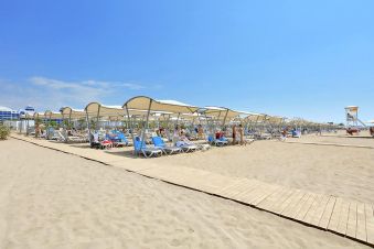 Плаж: Собствен пясъчен плаж точно пред хотела, удостоен със син флаг. Дължината на плажа е 220 м и платформа – 1800 м2. Шезлонги, чадъри, матраци, плажни кърпи - безплатно. Душ, съблекални. Павилиони на плажа, кея и край басейна (срещу заплащане).