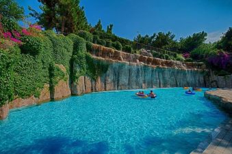 Собствен, пясъчно-чакълест плаж, дълъг 350 м, удостоен със сертификат "Син флаг". Намира се на 150-200 м от хотела, пътят минава по мост. Осигурен е безплатен шатъл до моста на всеки 15 минути, има достъп до плажа с асансьор. На разположение на гостите са 5 открити басейна, вътрешен отопляем басейн, аквапарк с 8 пързалки. Чадъри, шезлонги, плажни кърпи и матраци на плажа и при басейна се ползват безплатно.