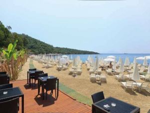 Собствен - пясъчен. Чадъри, шезлонги на плажа и при басейна - безплатно.