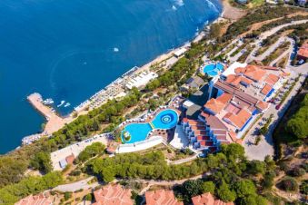 Разположение: Хотелът е разположен на хълм, заобиколен от тучна зелена природа от борове и палми с фантастична гледка към тюркоазеното Егейско море върху територия с обща площ от 140000м2. Намира се на 140 км от летище Милас-Бодрум, на 9 км от центъра на Кушадасъ и на около 10 км от античния град Ефес, на брега на морето.