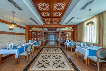 Основен ресторант, 3 а`ла карт ресторанта (средиземноморски, китайски и кебап, с предварителна резервация, едно безплатно посещение по време на престоя на един от ресторантите), 8 бара. Всеки ден се сервира закуска на шведска маса. Гостите могат да опитат ястия от азиатската и средиземноморска кухня, както и местни специалитети като кебап. В баровете се предлагат освежаващи напитки и леки закуски.
