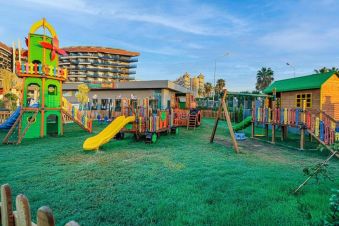 Собствен пясъчно-чакълест плаж на 450 м от хотела. До плажа води подземен тунел, през който се движи мини-влак от 08:00 до 18:00 часа. 2 открити басейна (неотопляеми), основен басейн с джакузи, 1 вътрешен басейн 206 кв.м (отоплява се през април, октомври и ноември, в зависимост от времето). Чадъри, шезлонги и плажни кърпи на плажа и при басейна се предлагат безплатно.