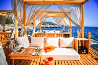 Плаж: Собствен, пясъчно-чакълест, непосредствено пред хотела. Две платформи. Шезлонги, чадъри, плажни кърпи – безплатно. Снек бар на плажа.